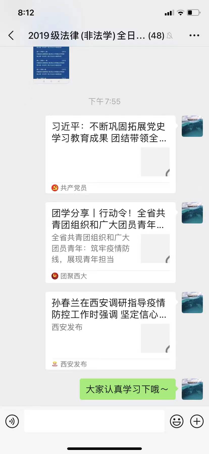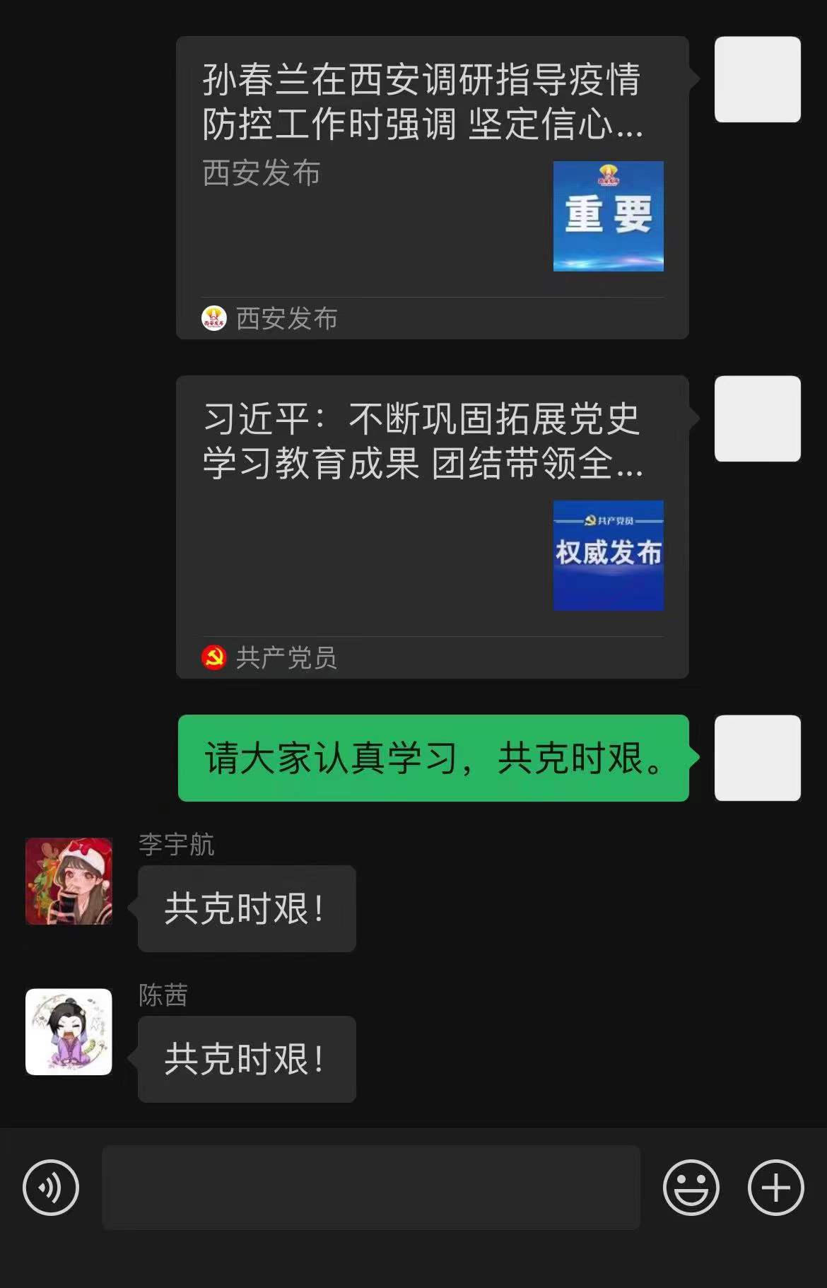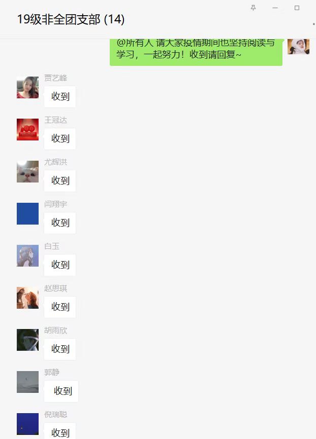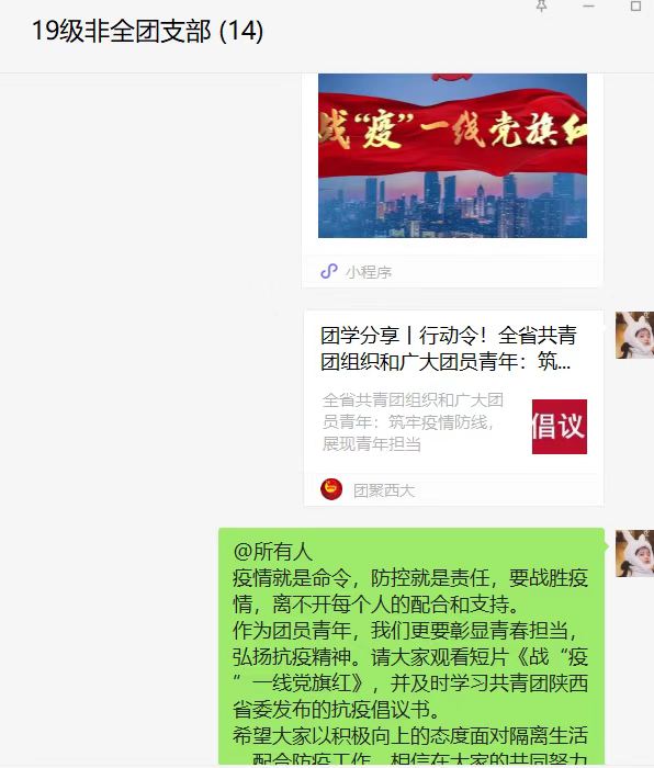 为了学习贯彻伟大抗疫精神,在西安市疫情的特殊时期,凝聚起战胜疫情的强大精神力量,2019级研究生各团支部通过线上分享的方式举办了本次主题团日活动,会议就西安疫情相关情况、抗疫知识、抗疫政策等内容展开讨论,在疫情期间增强团支部凝聚力。